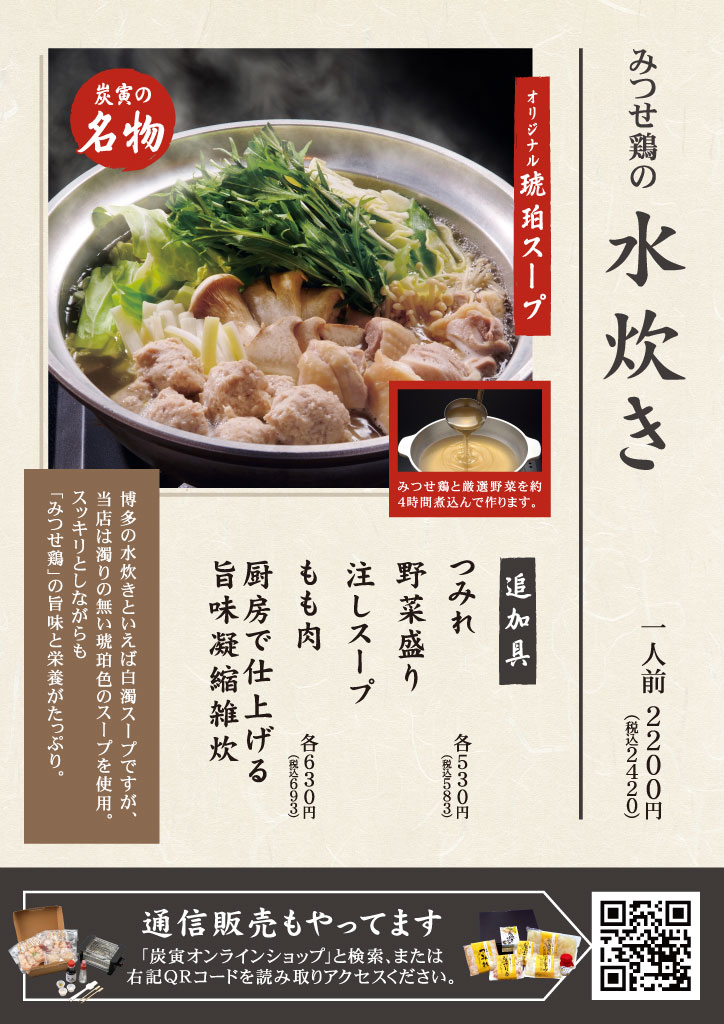 みつせ鶏を使った炭寅自慢の商品を、オンラインショップでお取り寄せいただけます。
