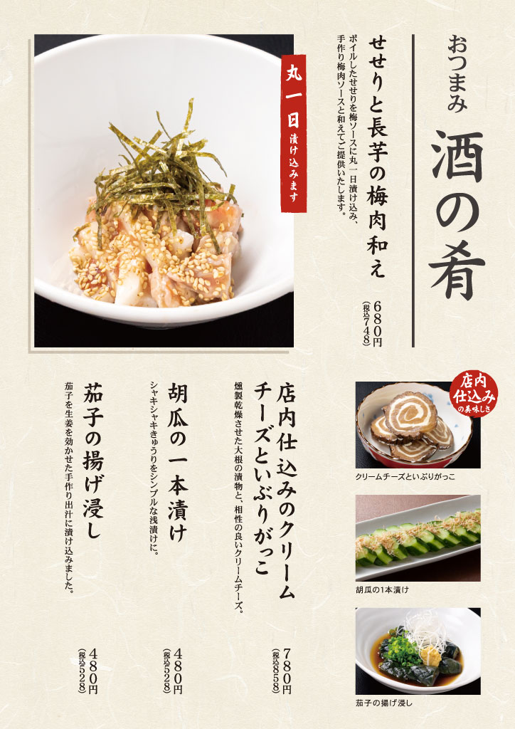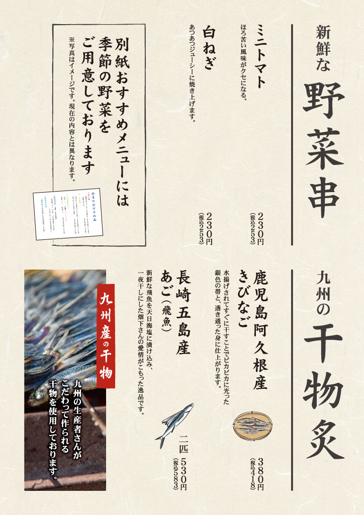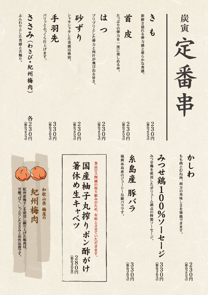 | 営業時間 | 月~土 17:00~23:00 日・祝日 17:00~22:00 |