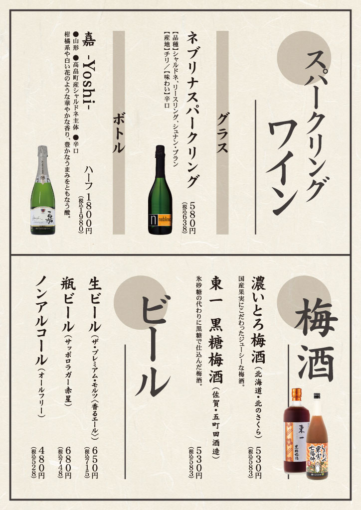 | 営業時間 | 火~金 17:00~23:00 土 16:00~23:00 日・祝日 16:00~22:00 |